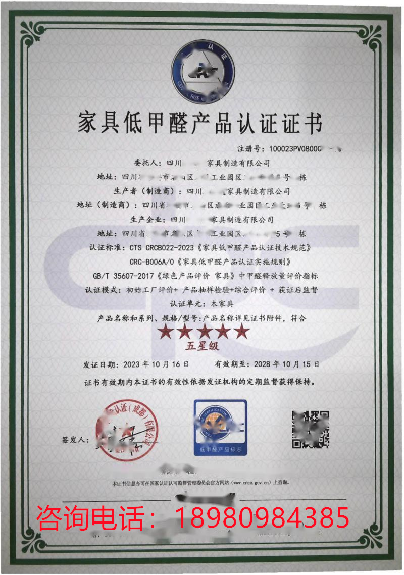 經(jīng)我公司的咨詢輔導(dǎo)服務(wù),四川某客戶已順利通過五星級(jí)家具低甲醛產(chǎn)品認(rèn)證,其證書信息已能在國家認(rèn)監(jiān)委官網(wǎng)查詢。