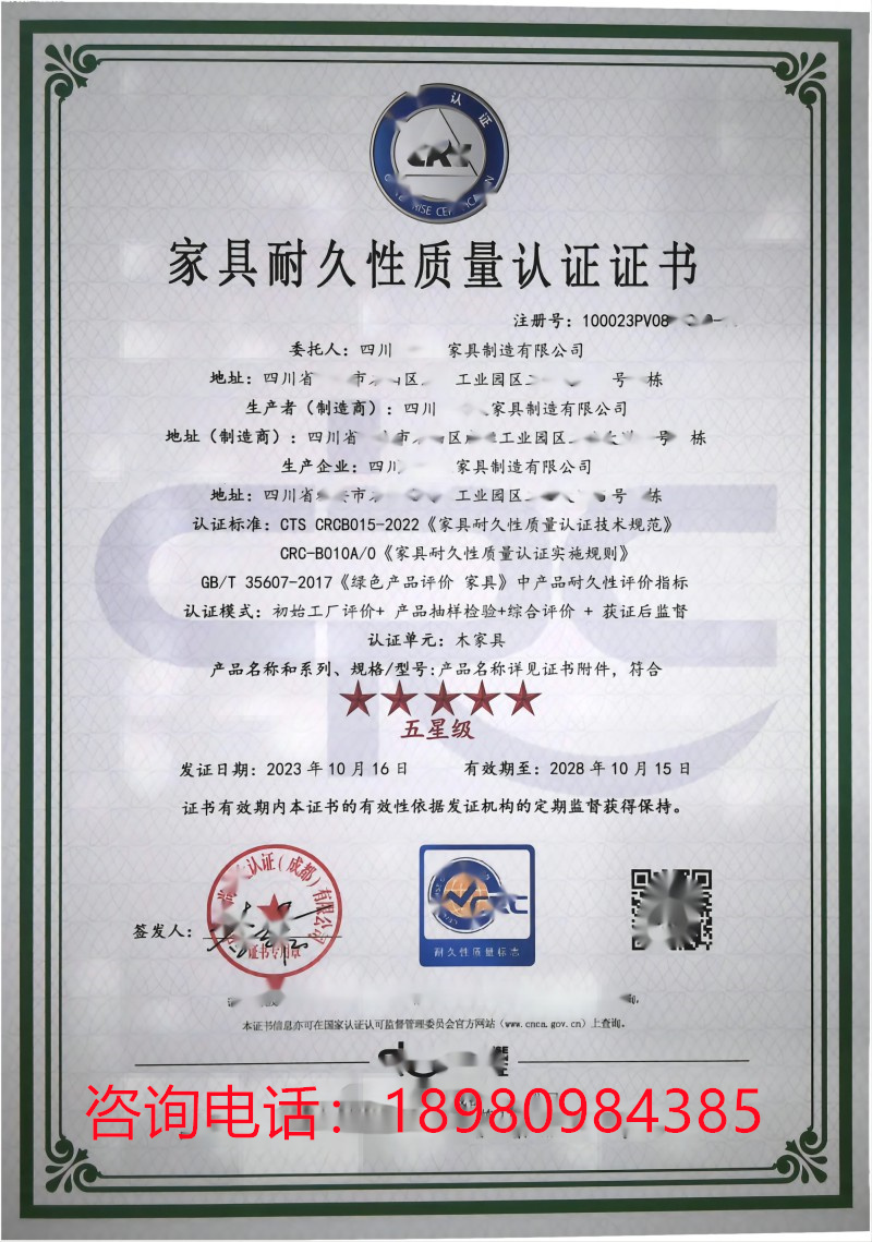 經(jīng)我公司的咨詢輔導服務,我司某客戶已順利通過五星級家具耐久性質(zhì)量認證,其證書信息已能在國家認監(jiān)委官網(wǎng)查詢。