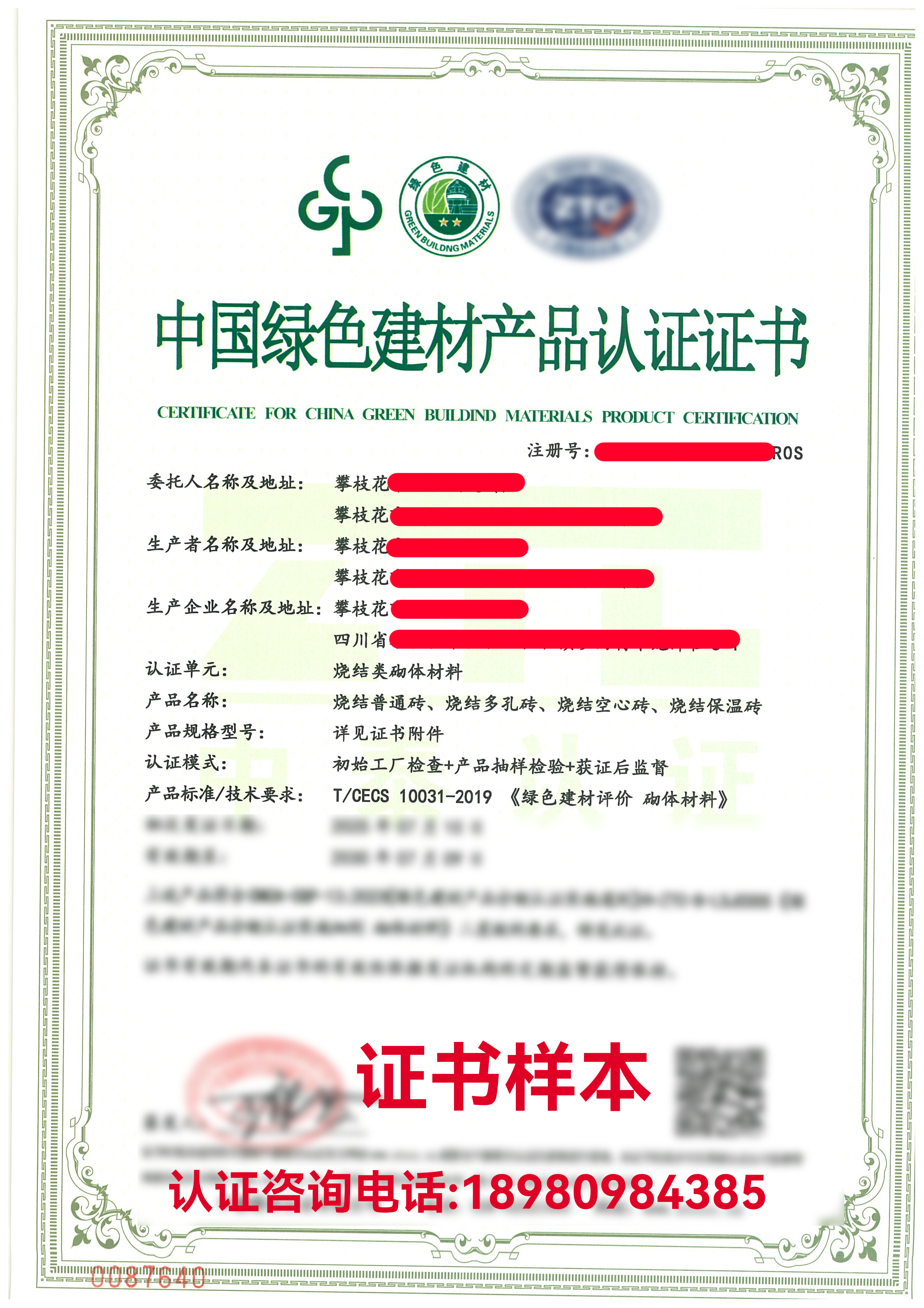 中國綠色建材產(chǎn)品認(rèn)證砌體材料證書樣本