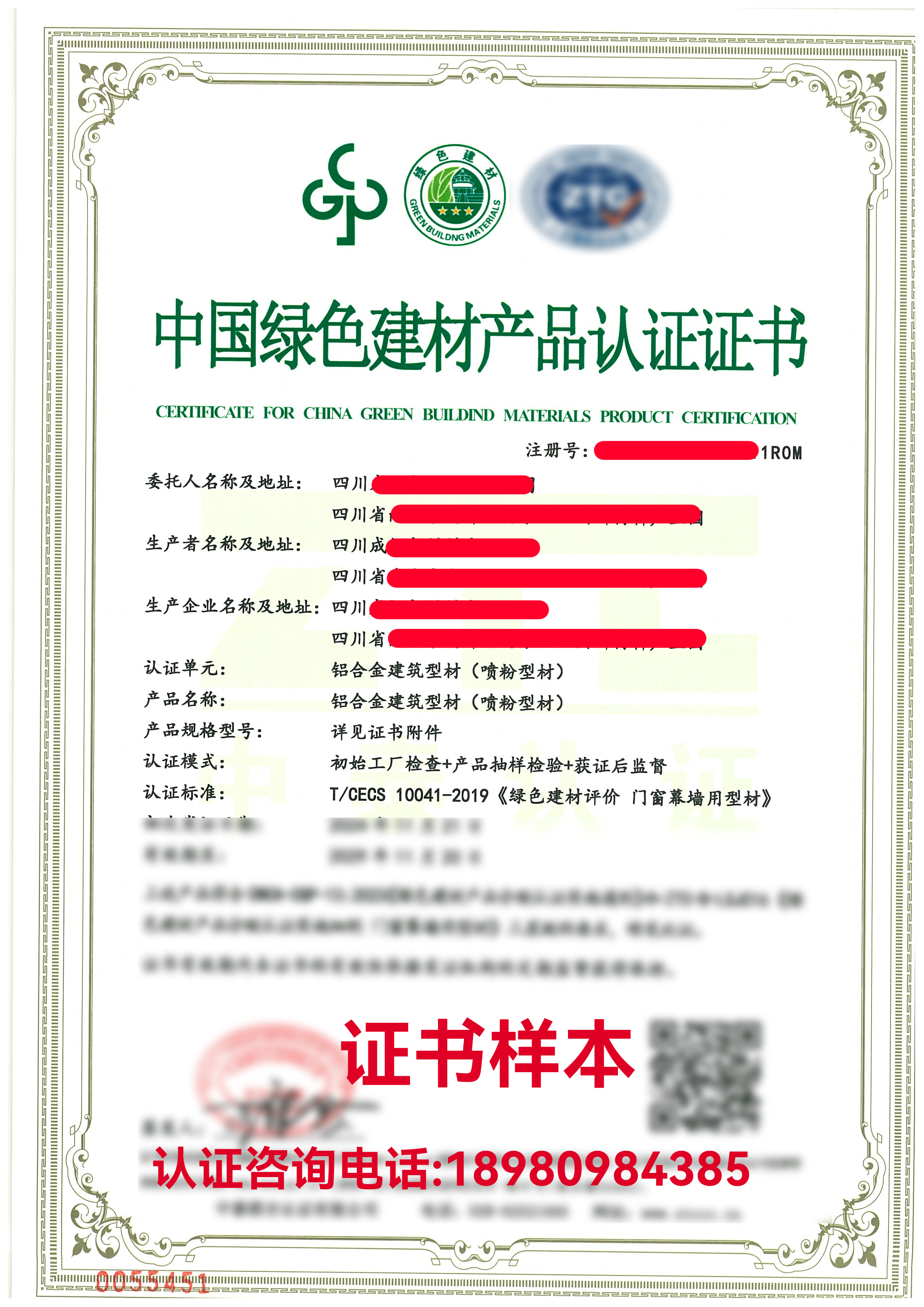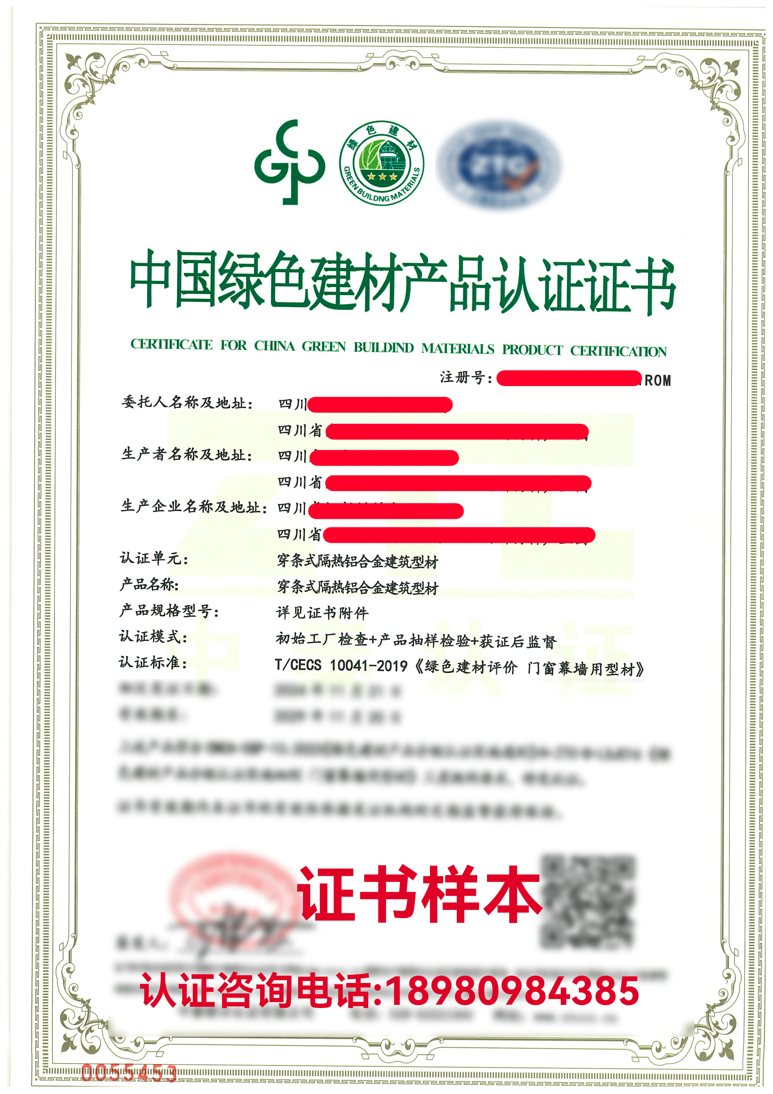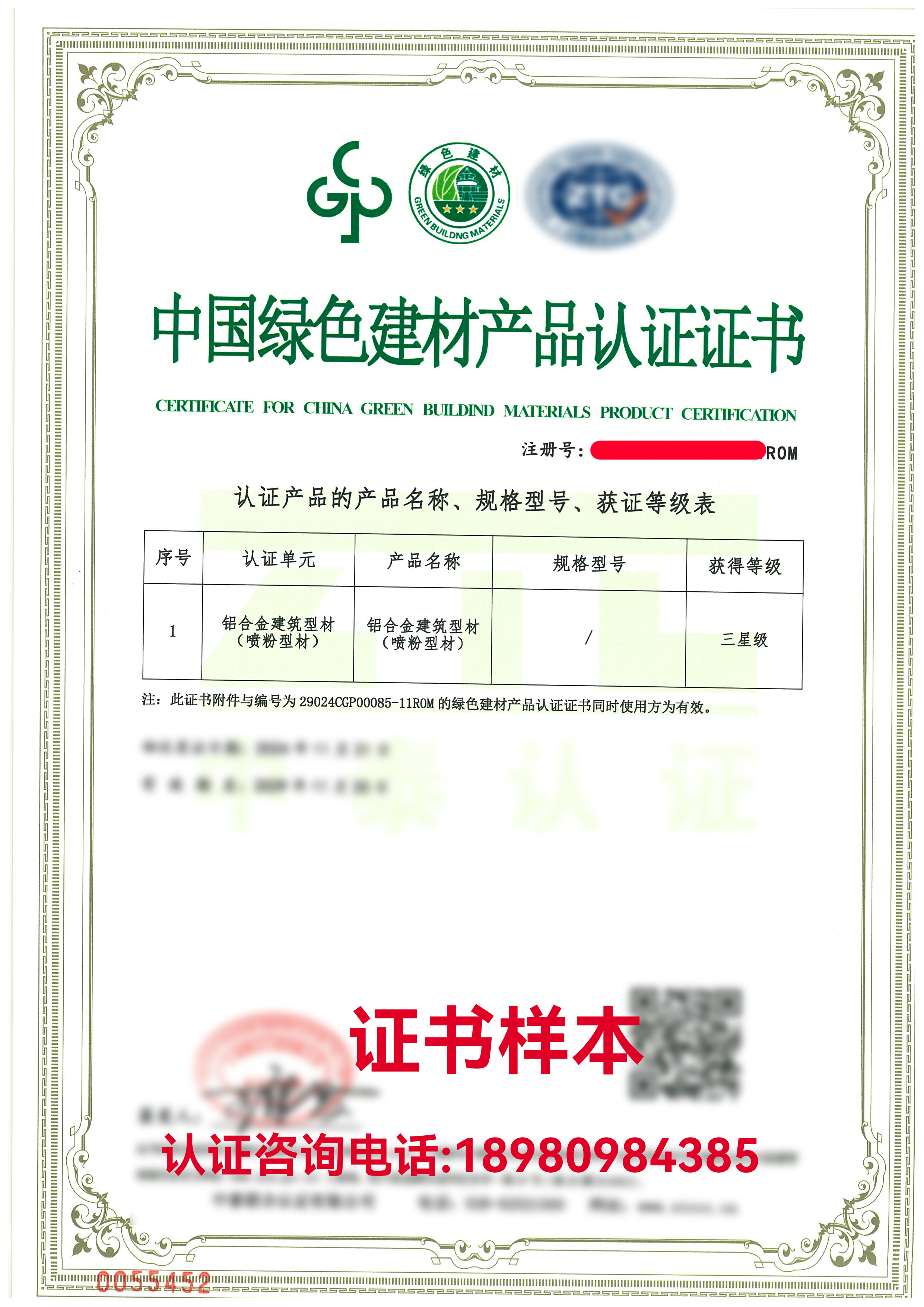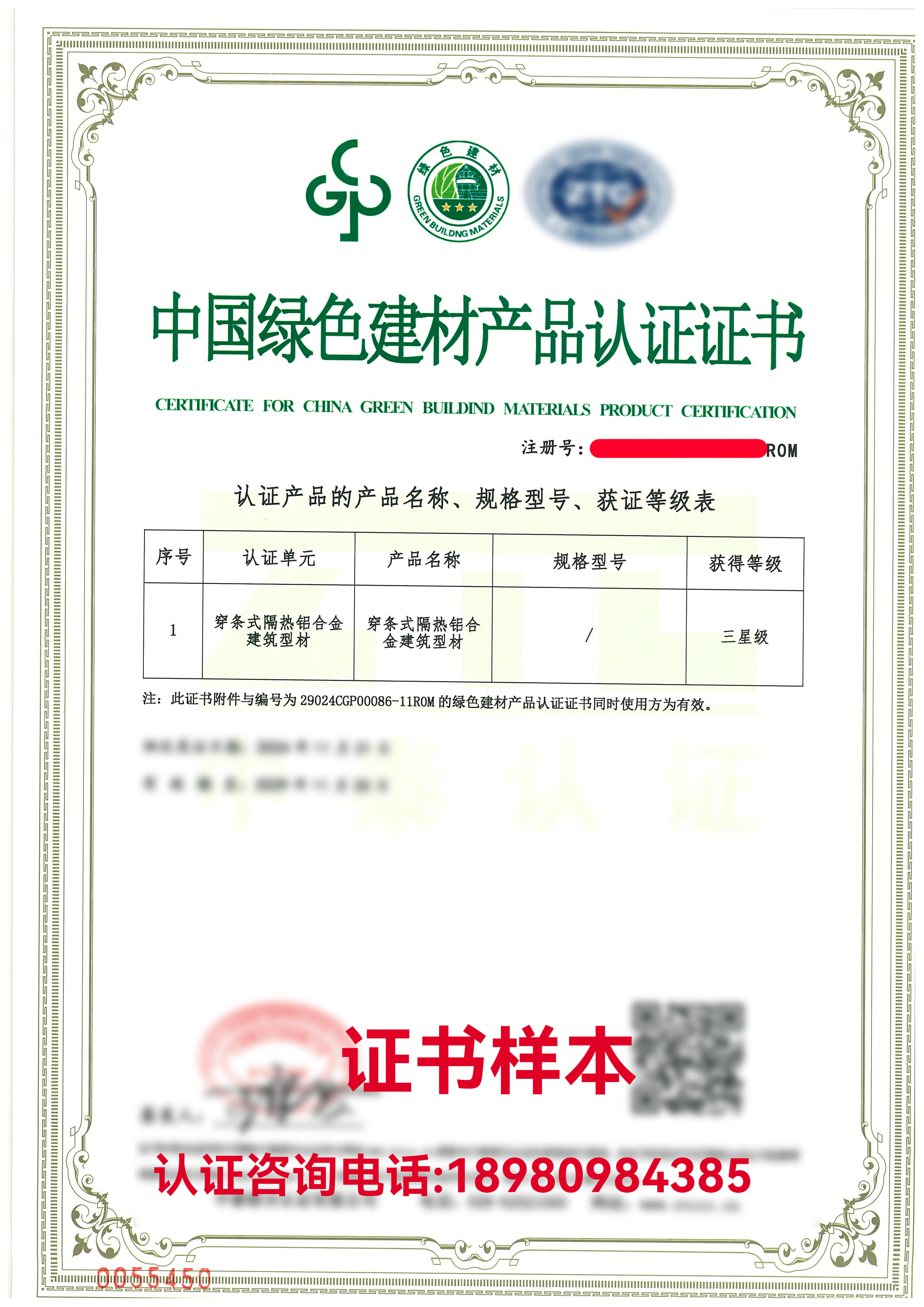 中國綠色建材產(chǎn)品認(rèn)證門窗幕墻用型材證書樣本