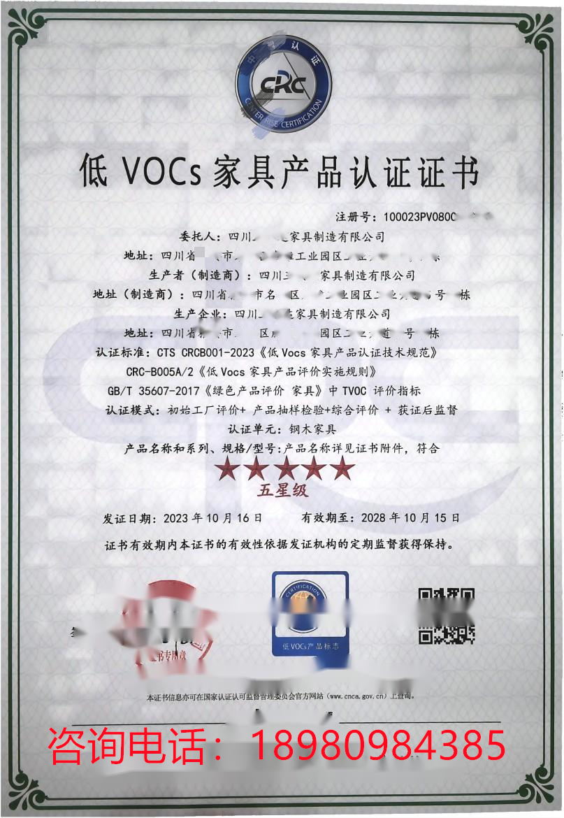 在我公司咨詢輔導(dǎo)下,四川某家具制造企業(yè)已順利通過五星級(jí)低VOCS家具產(chǎn)品認(rèn)證,其證書信息可在國(guó)家認(rèn)監(jiān)委官網(wǎng)查詢了。